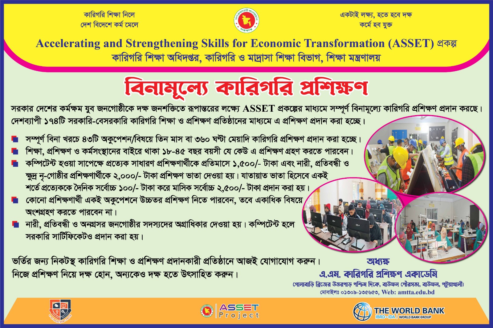 A.M. Technical Training Academy (AMTTA) has established since from 1999. Primarily AMTTA started various training activities from Bauphal, Patuakhali The training institution is promoting on sectoral training and accordance with the 11 trades has approved by Bangladesh Technical Education Board-BTEB